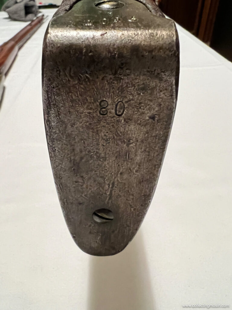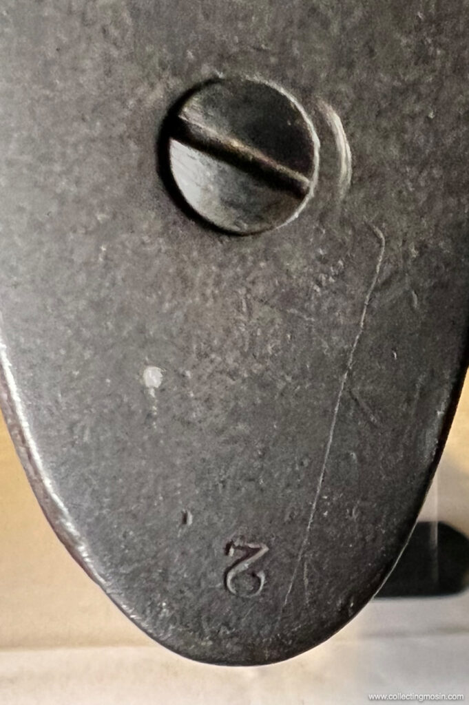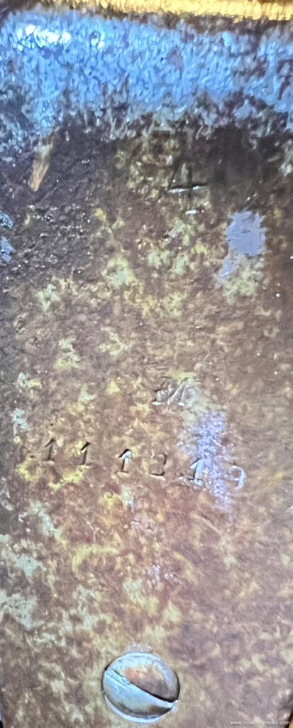 Anche la parte superiore di un calciolo può ospitare un mistero dei Mosin. Nella foto qui sopra, un poggia spalla prodotto da Tula presenta una strana marcatura non identificata: “ALIB.B.I.” L’esercito austro-ungarico e l’esercito imperiale tedesco talvolta marchiavano la parte superiore del calciolo dei Mosin Nagant catturati con il numero identificativo di alcune unità ma, in questo caso, non sono riuscito a trovare un riferimento per identificare questo marchio. Anche il punto alla fine del numero di matricola è insolito.